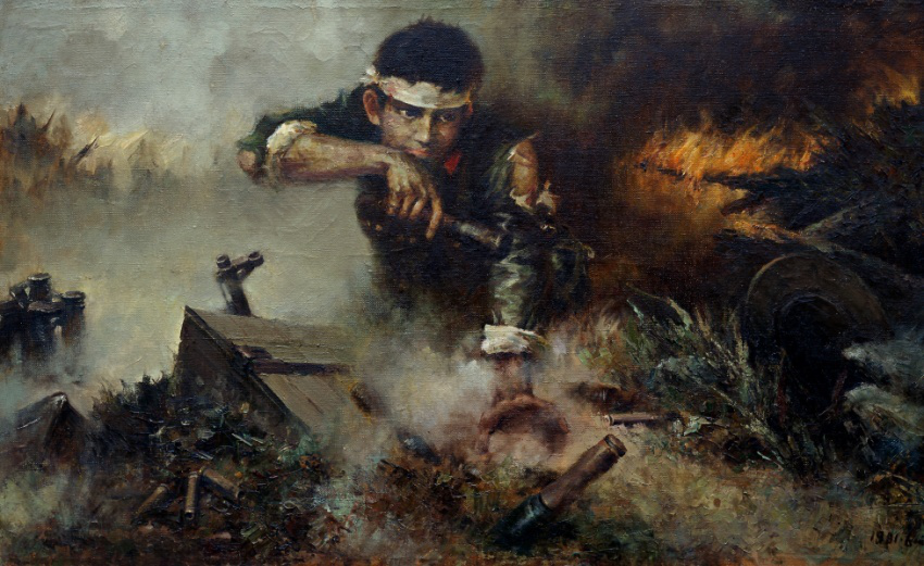 认识王立平,缘自一张画。这张画,刻骨铭心,如魂牵梦绕。画面是我边境自卫反击作战中,一场激战的局部特写,震耳欲聋的炮弹,交织横飞的子弹,硝烟弥漫中,一位头部严重负伤的士兵,抓起一枚手榴弹,咬断引火线,用尽全力投向又一次试图冲上来的敌人……画面中喷火的眼神,叩紧的牙齿,滴血的绷带,爆裂的军装,嵌进泥土的手指,还有,戳立的武器,倾斜的弹药箱,散乱的弹药,燃烧的车辆,浓烈的硝烟,无不显示战争的残酷,士兵的英勇,也无不展现画的真实,画的厚重。